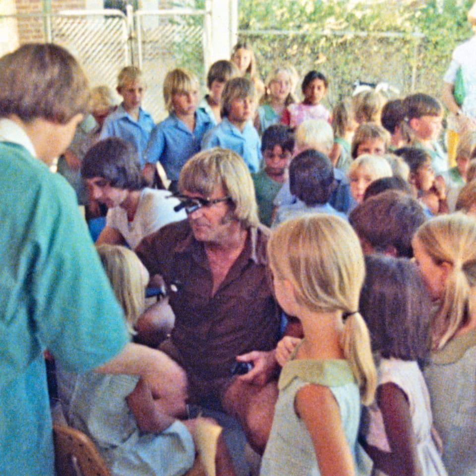 Fred Hollows examining the eyes of school children during The National Trachoma and Eye Health Program in the 1970s.