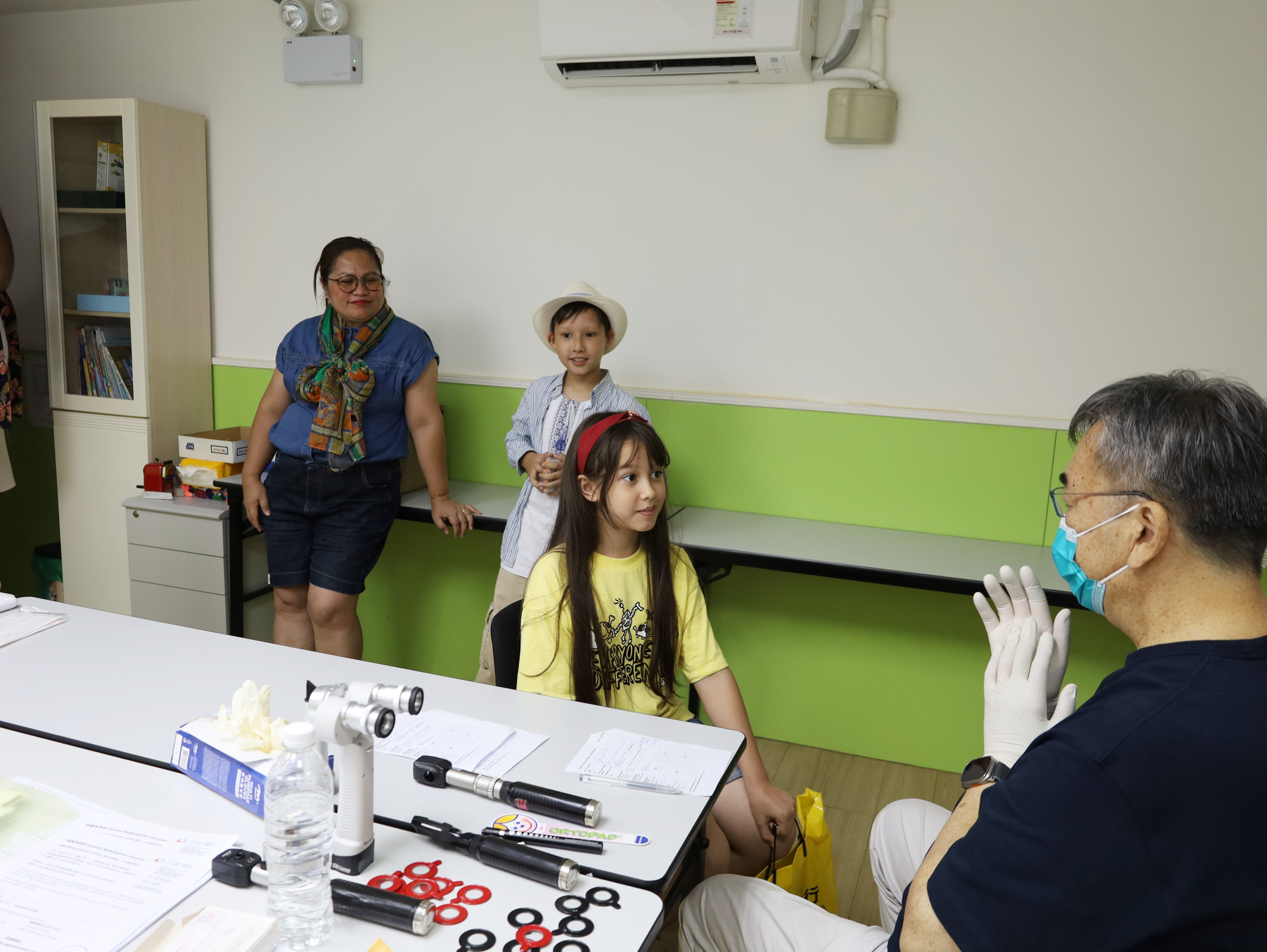 參加者 Mysko Geraldine Abiso 透過基督教勵行會得悉護瞳行動的免費驗眼服務,由眼科專科醫生兼顧問林傑人醫生及現場義工為她進行眼科檢查。